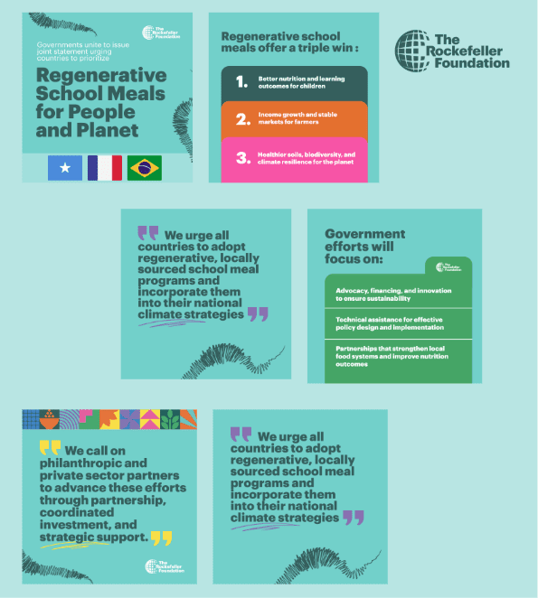 We supported the Rockefeller Foundation to develop a series of global convenings, bringing together partners from NGOs, policymakers, philanthropic and the private sector to recognise the role regenerative agriculture can play in making school meal programmes even more impactful. We supported with messaging, visual design and content as well as event design, speaker briefings and event collateral at a signature convening in Ethiopia, at Climate Week NYC and at COP30.