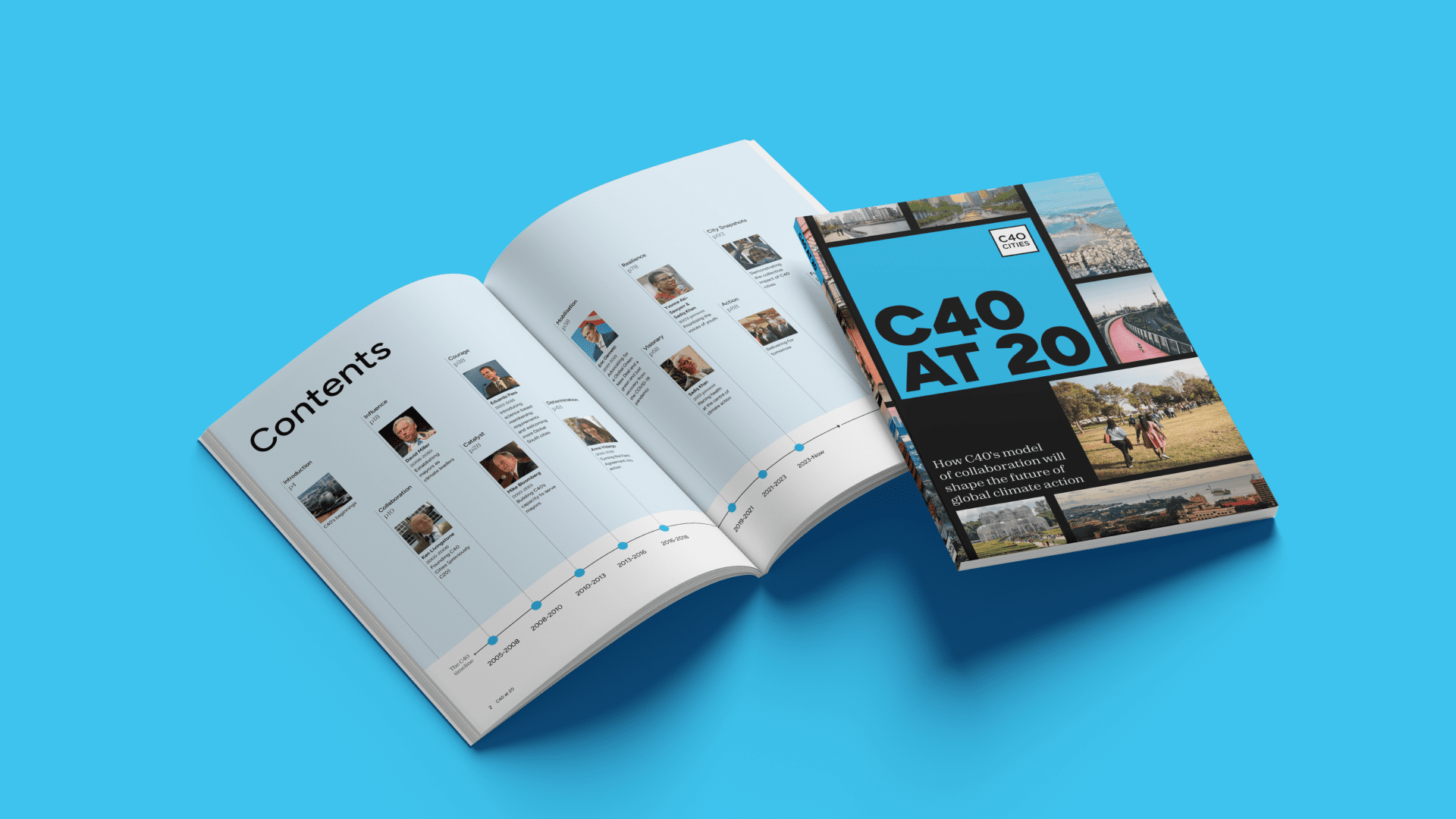 - • Production of a 200-page anniversary publication capturing C40’s history, impact and city leadership. The book featured case studies and key learnings from current and previous C40 Chairs, all prominent internationally recognised city mayors like Mike Bloomberg, Anne Hidalgo and Sidiq Khan and was translated into four additional languages.